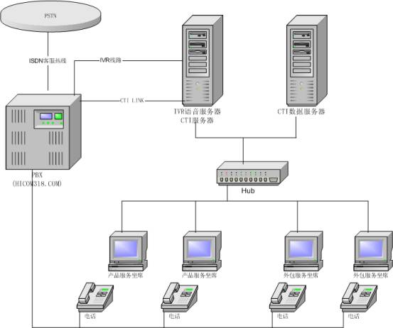 Siemens Hicom318.com交換機(jī):接入ISDN中繼線,設(shè)置人工座席分機(jī),為CTI,IVR語音服務(wù)器提供16路IVR端口和CTI LINK控制電纜。