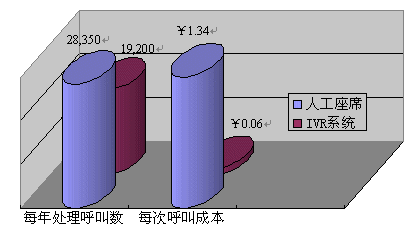 據(jù)統(tǒng)計,一個72線的IVR系統(tǒng)每年能夠處理2,300,000的接入電話,平均每線IVR一年能夠處理32,000個接入電話,依照60%的有效話務處理率(即80%的接入電話可以不轉人工即可完成服務)來計算,即四年期每線的投入¥4569總共可以處理76,800個電話,即便是計算上系統(tǒng)維護費用,平均處理每個電話的成本僅為0.06元。