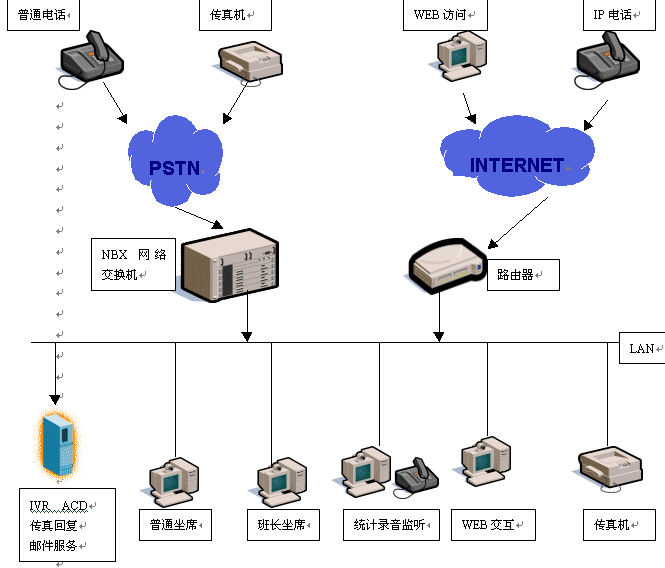 基于NBX 網(wǎng)絡(luò)交換機的呼叫中心對外部有PSTN和IP兩種接口,可以接入各種類型用戶:普通電話用戶、傳真用戶、WEB訪問用戶、IP電話用戶。NBX呼叫中心通過NBX網(wǎng)絡(luò)交換機將外部的PSTN信號轉(zhuǎn)換為以太網(wǎng)數(shù)據(jù)包信號,在呼叫中心內(nèi)部通過局域網(wǎng)提供話音與數(shù)據(jù)服務(wù)的集成,從而即以開放的局域網(wǎng)包交換技術(shù)實現(xiàn)專用 PBX的話音服務(wù)功能并與現(xiàn)有局域網(wǎng)無縫集成,從而實現(xiàn)包括E-mail、傳真、聊天工具、視頻以及話音在內(nèi)的由多種通信媒介的交互。NBX呼叫中心通過統(tǒng)一的ACD將各種通訊方式的訪問協(xié)調(diào)分配,最終實現(xiàn)了呼叫的中心運營和諧與高效。