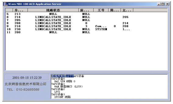 NBX呼叫中心的核心設(shè)備是3Com公司的NBX網(wǎng)絡(luò)交換機,NBX網(wǎng)絡(luò)交換機支持開放式電話開發(fā)平臺TAPI2.X,TAPI它是Microsoft電話技術(shù)應(yīng)用程序編程界面標準,運用TAPI可以方便、高效地完成針對語音線路的控制開發(fā),從而完成自動語音應(yīng)答(IVR)、自動話路分配(ACD)、以及坐席接待、計費、錄音等需求。使用TAPI這種標準使得用戶可以集成第三方CTI程序以完成各種高級需求。