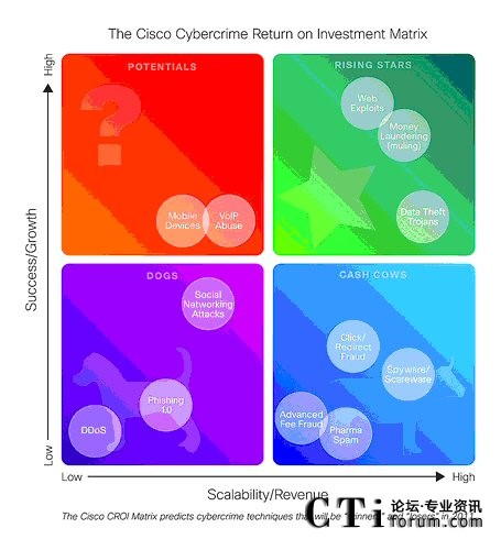 思科網(wǎng)絡(luò)犯罪投資回報(bào)(CROI)矩陣:在《思科2009年年網(wǎng)絡(luò)安全報(bào)告》中首次推出的思科CROI矩陣模型根據(jù)思科安全人士對尋求利益的犯罪者將使用的各種手段的預(yù)測,分析了2011年各種犯罪的類型。該矩陣根據(jù)2010年的表現(xiàn),預(yù)計(jì)如Zeus等竊取數(shù)據(jù)的木馬,易于部署的網(wǎng)絡(luò)釣魚,以及錢騾將會(huì)是2011年主要的犯罪形式!坝写疾臁钡馁嶅X工具包括手機(jī)惡意軟件—木馬如今已經(jīng)存在于SymbOS和Zitmo.Altr手機(jī)平臺中(Zitmo就是指手機(jī)中的Zeus)。另一方面,盡管社交網(wǎng)絡(luò)在去年《年度報(bào)告》潛在因素目錄中排名靠前,2011年它將不再是為網(wǎng)絡(luò)犯罪創(chuàng)造機(jī)會(huì)的重要途徑。不過這也并不意味著社交網(wǎng)絡(luò)詐騙將有所減少,它們僅僅是如Zeus木馬等惡意網(wǎng)站欺詐行為的一個(gè)小的環(huán)節(jié)。