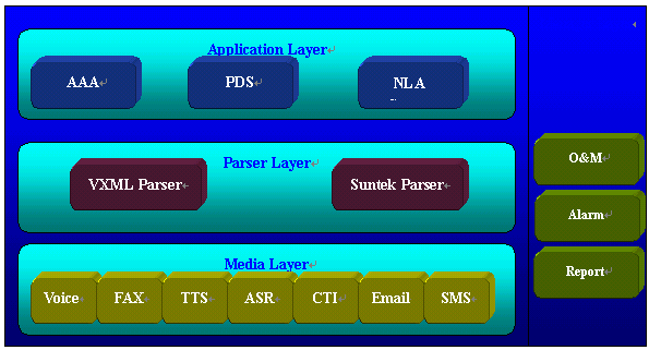 SSurnon-IVR系統(tǒng)分為支撐系統(tǒng)和應用服務器兩大部分,支撐系統(tǒng)的核心為Browser Layer。由它來解釋和執(zhí)行流程的業(yè)務邏輯,由Media