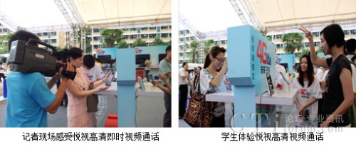 這次在廣州大學城開展的發(fā)布會,吸引了很多在校大學生的參加,下圖是記者和學生現(xiàn)場體驗通過悅視高清視頻通話玩即時猜拳游戲,傳輸?shù)乃挟嬅娣浅G逦鲿常瑦傄暜a(chǎn)品的優(yōu)質(zhì)體驗讓人享受無線高質(zhì)量流媒體服務的同時深刻感受到TD-LTE高帶寬、低時延的優(yōu)勢。