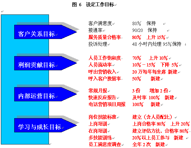 | 1 | 分4批招聘100位新員工,滿足話務(wù)量增長(zhǎng)的需要 | 接通率90% 上崗合格率80% 工作飽和度70% |
