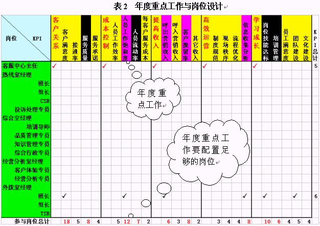 在這里,我們先以崗位設(shè)計(jì)來舉例。經(jīng)常有呼叫中心主管把每個(gè)崗位的職責(zé)都設(shè)計(jì)的非常詳細(xì),包括了每天來做什么,說什么,錄入什么,甚至是打掃某區(qū)域衛(wèi)生之類。但是,我看遍了每一條,也沒找到這個(gè)崗位應(yīng)該對(duì)什么業(yè)績(jī)"負(fù)責(zé)任",該對(duì)哪些工作做出貢獻(xiàn)。此處建議各位把效益評(píng)價(jià)體系、年度重點(diǎn)工作與崗位設(shè)計(jì)結(jié)合起來。如表2所示,我們可以把效益評(píng)價(jià)體系作為KPI放在橫坐標(biāo)中,而崗位設(shè)置則是縱坐標(biāo)。每個(gè)崗位對(duì)應(yīng)的行中,可以勾畫其應(yīng)負(fù)責(zé)或者做出主要貢獻(xiàn)的項(xiàng)目。這些項(xiàng)目不能超過6個(gè),因?yàn)樘嗟捻?xiàng)目會(huì)使得這個(gè)崗位無所適從,最終的結(jié)果是哪個(gè)也沒做好。當(dāng)你勾畫完成之后,請(qǐng)計(jì)算每列的"對(duì)勾"數(shù)目,看看你本年度的重點(diǎn)工作是不是有較多崗位負(fù)責(zé)呢?