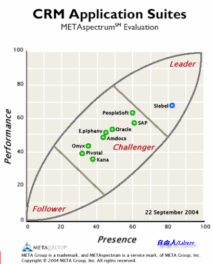 從圖表可看到,在當時Siebel是CRM市場的領(lǐng)先者,mySAP CRM、Oracle CRM、PeopleSoft CRM都是第二集團的競爭者。