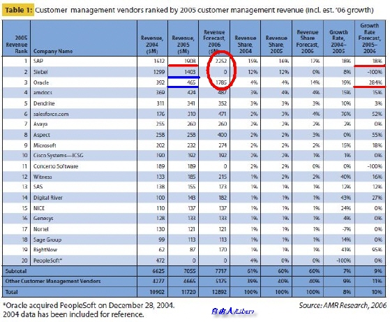 從圖中可以看出,2005年SAP CRM的全球營收為19.08億美元,Oracle+Siebel(PeopleSoft已計入Oracle)CRM的全球營收為18.69億美元,落后于SAP CRM。ARM Research的預(yù)計,SAP CRM在2006的營收將達22.52億美元,而Oracle Siebel則只有17.85億美元。