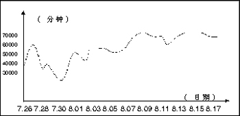 延吉通信從7月10日開(kāi)始正式作宣傳,8月1日后每天時(shí)長(zhǎng)均保持在55000分鐘以上。最新統(tǒng)計(jì)表明,自2002年7月至今,該業(yè)務(wù)已為延吉通信公司創(chuàng)造2500萬(wàn)分鐘以上的市話增值。