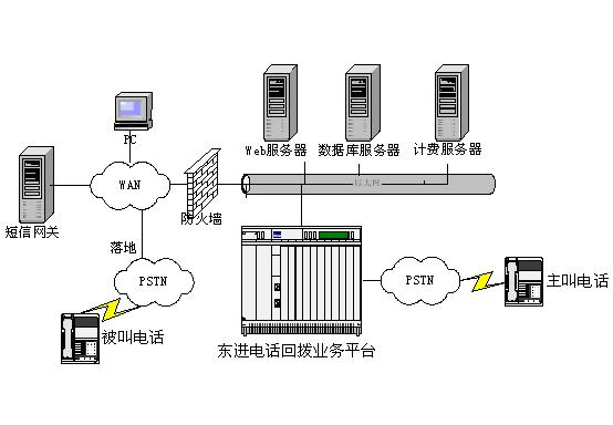 東進(jìn)電話回?fù)芟到y(tǒng)由東進(jìn)電話回?fù)芷脚_(tái)、數(shù)據(jù)庫(kù)服務(wù)器、Web服務(wù)器和計(jì)費(fèi)服務(wù)器組成。虛擬運(yùn)營(yíng)商在基礎(chǔ)運(yùn)營(yíng)商那租用模擬或數(shù)字中繼電話線路連接到東進(jìn)電話回?fù)芷脚_(tái),回?fù)苤鹘杏脩羰褂肞STN線路,撥被叫用戶使用寬帶IP寬帶網(wǎng)絡(luò),虛擬運(yùn)營(yíng)商需要尋找落地資源,通過(guò)互聯(lián)網(wǎng)可以很容易得到。