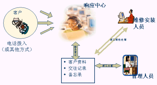 談起客戶服務部門的流程管理,我想許多有過這方面經驗的人可能會覺得頭大,因為它涉及環(huán)節(jié)多,如派工、配件管理、人員管理、總部對分公司的管理等等。因此,在服務管理系統(tǒng)中,就提供了一種自動化的流程管理,涵概了服務部門的所有業(yè)務應用,包含了客戶響應處理、服務派工管理、配件管理、員工管理以及總部對分公司的管理等,迅速構架公司總部與各地分公司溝通渠道,解決總部與分公司信息流轉的問題。下圖反應了服務流程管理過程。