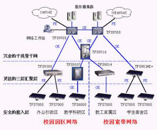 骨干交換機提供線速三層交換,接入層交換機線速二層交換保證全網(wǎng)無阻塞性能