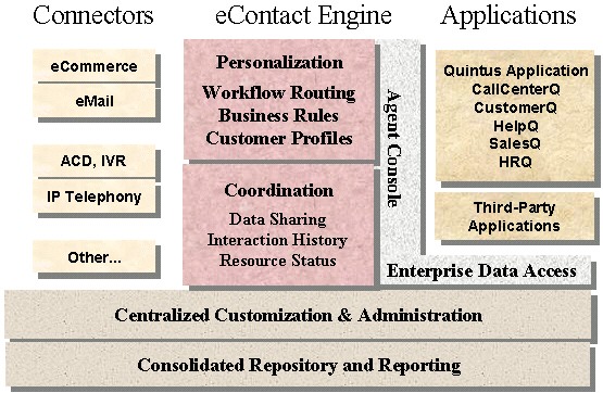 在CRM的實(shí)施中,有很多決定實(shí)施成敗的關(guān)鍵因素,其中之一就是CRM解決方案。目前,市場上的CRM產(chǎn)品林林總總,如國外的Siebel、SAP、Oracle、Clarify、Vantive,國內(nèi)創(chuàng)智的PowerCRM、用友的NC/CRM、聯(lián)成互動的MyCRM、中圣的SellWell、TurboCRM等,各有自身的特色和優(yōu)勢。本文將從CRM理念的角度介紹另一款CRM解決方案——Quintus eContact Suit(簡稱QeS)解決方案,以供用戶甄選。