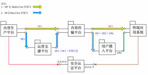 系統(tǒng)根據(jù)功能可分成內(nèi)容制作、節(jié)目傳輸、安全認(rèn)證、計(jì)費(fèi)營業(yè)、接入處理和終端六個部分。整個系統(tǒng)始終貫穿媒體流和數(shù)據(jù)流,確保各個部分能夠有效的協(xié)作。