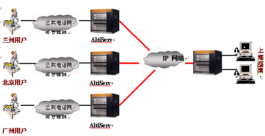 奧迪堅(jiān)分布式呼叫中心方案可以分為多對(duì)多(圖1)和多對(duì)一(圖2)兩種形式,但都能夠?yàn)橛脩籼峁┍镜睾艚校惖胤⻊?wù)的功能。各個(gè)服務(wù)點(diǎn)之間是對(duì)等關(guān)系或隸屬關(guān)系,它們分布于不同的地理位置,在運(yùn)作時(shí)間、資源、功能上互相協(xié)作,為用戶提供最大限度的服務(wù)。如果基于奧迪堅(jiān)通訊系統(tǒng)的分布式呼叫中心,用戶在北京,廣州或蘭州的任何一個(gè)地方撥打本地的服務(wù)電話,都可以通過(guò)IP網(wǎng)絡(luò),自動(dòng)路由到上海的坐席,由上海的坐席來(lái)為用戶提供統(tǒng)一的服務(wù),此謂多對(duì)一模式。如果北京、上;驈V州的用戶撥打本地電話后,系統(tǒng)經(jīng)過(guò)網(wǎng)絡(luò)排隊(duì)和自動(dòng)路由,被分配到三個(gè)城市中任意一個(gè)正在空閑的或正適合此項(xiàng)服務(wù)的坐席,此謂多對(duì)多。