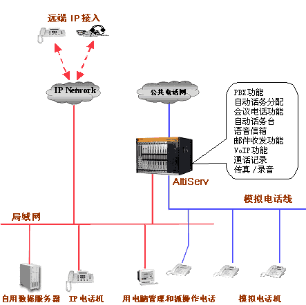 用很少的投資搭建一個(gè)以Altiserv為中心的網(wǎng)絡(luò)電話系統(tǒng)可以基本滿足企業(yè)的辦公, 數(shù)字、語(yǔ)音及多媒體通訊的全方位需求。而且隨著您企業(yè)的不斷發(fā)展壯大,奧迪堅(jiān)隨時(shí)可為您增加任何您所需的功能。