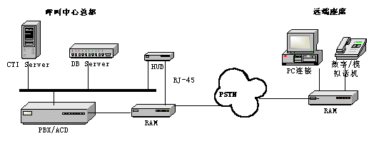 用戶通過(guò)連接在RAM的電話撥號(hào)向總部發(fā)出連接請(qǐng)求,通過(guò)專用線或PSTN網(wǎng),與呼叫中心總部的PBX和網(wǎng)絡(luò)聯(lián)接,(當(dāng)然也要通過(guò)一個(gè)RAM接口服務(wù)器器)。