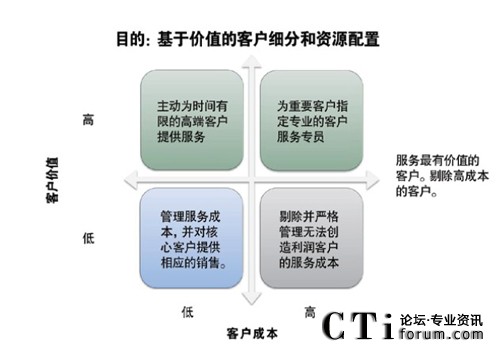 現(xiàn)實情況是,許多采取該策略的公司都僅將基于價值的客戶細(xì)分應(yīng)用于高價值、高成本的客戶,而不是應(yīng)用于已有客戶的絕大部分。這是一種不可持續(xù)的商業(yè)行為。然而,許多公司之所以這樣做,是因為公司在所有的客戶細(xì)分領(lǐng)域,無視價值高低,不加區(qū)分的投入成本和服務(wù),會存在風(fēng)險,即讓服務(wù)更多的投入到價值不高,卻又經(jīng)常呼入的客戶上,從而忽視了一些更有 的客戶,這些客戶會傾向于在不同的銷售和服務(wù)階段,通過不同渠道提出詢問。