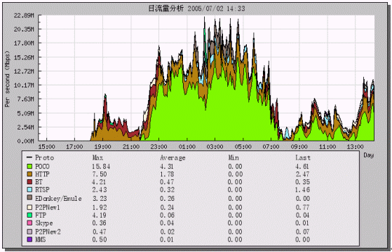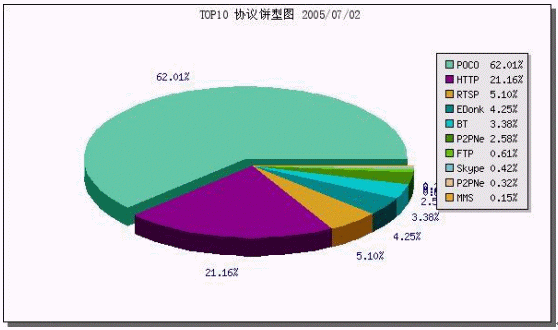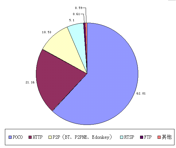 3. 監(jiān)控時間段內(nèi),POCO流量占62.01%,HTTP占21.16%,RTSP(在線視頻)占5.1%,P2P業(yè)務(wù)(包括EDonkey、P2PNE、BT等)占10.53%,F(xiàn)TP為0.61%,其他業(yè)務(wù)不到0.59%。如下圖: