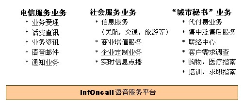 InfOnCall語(yǔ)音服務(wù)平臺(tái)應(yīng)用于電信服務(wù)業(yè),能為運(yùn)營(yíng)商提供相當(dāng)廣的業(yè)務(wù)范圍。