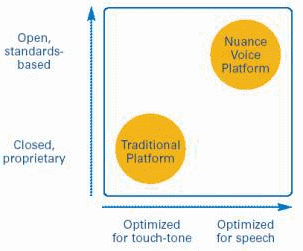 傳統(tǒng)的平臺(tái)是基于封閉的、非統(tǒng)一標(biāo)準(zhǔn)的技術(shù)并為按鍵式輸入應(yīng)用而設(shè)計(jì)的,而Nuance NVP平臺(tái)是開放的、基于統(tǒng)一標(biāo)準(zhǔn)的語音平臺(tái)產(chǎn)品,它能夠支持客戶公司已有的IT投資和基礎(chǔ)設(shè)備,同時(shí)可以加入語音的應(yīng)用,提高了信息傳遞的自動(dòng)化程度和客戶的滿意度。