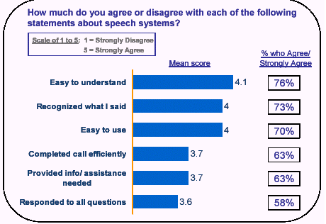 此外,十個人中九個人認為他們從使用語音服務中得到了在鍵盤式服務中得不到的價值不菲的好處,并有70%的人說如果語音服務系統(tǒng)取代了按鍵式系統(tǒng)的話,他們的效率也將得以提高。