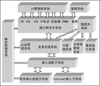 綜合付費平臺的軟件邏輯結(jié)構(gòu)分為語音接入處理子系統(tǒng)、Internet 接入子系統(tǒng)、接入適配網(wǎng)關(guān)子系統(tǒng)、認(rèn)證管理子系統(tǒng)、業(yè)務(wù)處理系統(tǒng)、卡管理系統(tǒng)、分銷商管理系統(tǒng)、查詢統(tǒng)計系統(tǒng)、數(shù)據(jù)庫系統(tǒng)、接口網(wǎng)關(guān)子系統(tǒng)和維護管理子系統(tǒng)。