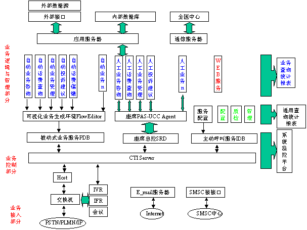 平臺部分完成系統(tǒng)的基本服務(wù)處理,不針對具體的服務(wù)業(yè)務(wù),提供電話接入、呼叫控制、人工/自動服務(wù)、e_mail服務(wù)、WEB服務(wù)、SMSC服務(wù)等的基礎(chǔ)環(huán)境。業(yè)務(wù)部分完成系統(tǒng)的業(yè)務(wù)描述,按照平臺的業(yè)務(wù)接口,針對聯(lián)通1001客戶服務(wù)的每一個具體業(yè)務(wù)需要,開發(fā)相應(yīng)的服務(wù)業(yè)務(wù)功能模塊或流程,實現(xiàn)系統(tǒng)的服務(wù)業(yè)務(wù)。業(yè)務(wù)部分完全建立在PAS-UCC平臺之上。