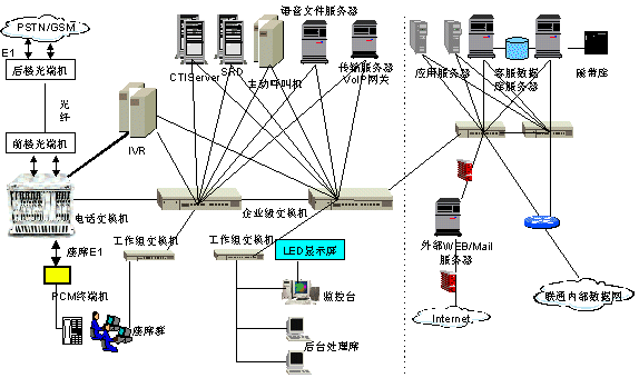 用戶撥打聯(lián)通客戶服務(wù)系統(tǒng)特服號碼1001,呼叫經(jīng)過電話網(wǎng)絡(luò)匯接到省中心匯接局,然后接入本系統(tǒng)。本系統(tǒng)的呼叫匯接采用《中國聯(lián)通客戶服務(wù)系統(tǒng)技術(shù)規(guī)范書》規(guī)定的匯接方式。