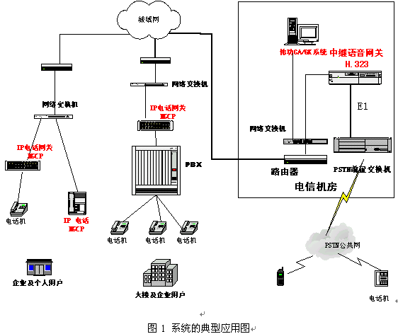 系統(tǒng)的真正價值應該在實際應用中得以體現(xiàn)。這套系統(tǒng)的很重要的一個應用領域就是VoIP接入網(wǎng)的建設。其典型的應用如圖1所示。