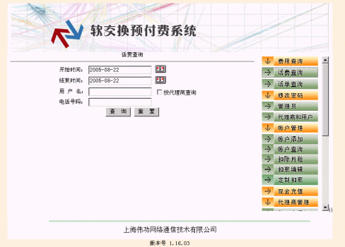 - 話費查詢:可根據(jù)用戶名稱(代理商名稱)、主叫號碼(或號碼段)、起止時間等條件快速查詢通話費用。