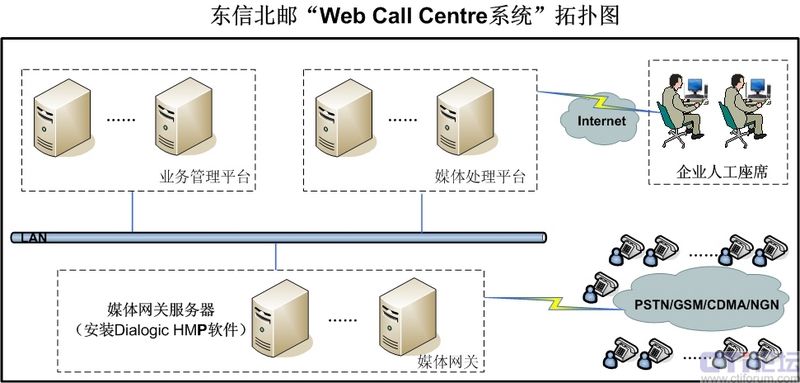 隨著中國經(jīng)濟的快速發(fā)展,越來越多的企業(yè)尤其是中小企業(yè)對呼叫中心的需求量越來越大,需求質(zhì)量也越來越高。由于呼叫中心建設涉及技術十分專業(yè)、涉及領域也比較廣泛、必須投入巨大的資金購買軟硬件設備,并且需要大量的維護力量,因此對于中小企業(yè),尤其是缺乏專業(yè)技術力量和資金的中小企業(yè)來說,建設自有的呼叫中心顯得不切實際。正是基于這種情況,EB開始與Dialogic合作,采用其HMP系統(tǒng)軟件,以IP技術為基礎,依托電信網(wǎng)絡,建設呼叫中心系統(tǒng),以托管方式為客戶提供呼叫中心服務,即Web Call Centre服務。