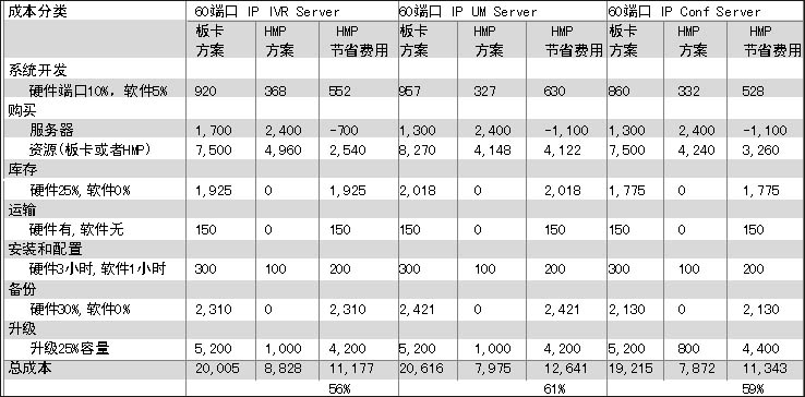 在眾多好處當(dāng)中,對(duì)用戶最有吸引力的無(wú)疑是節(jié)省成本。張怡國(guó)特別強(qiáng)調(diào),對(duì)一個(gè)應(yīng)用系統(tǒng)而言,成本的計(jì)算不應(yīng)該單以產(chǎn)品端口購(gòu)買(mǎi)價(jià)格考核,而應(yīng)該是系統(tǒng)總的建設(shè)成本,包括產(chǎn)品購(gòu)買(mǎi)成本、服務(wù)器成本、運(yùn)輸、安裝、庫(kù)存、升級(jí)等多項(xiàng)費(fèi)用;贖MP1.1版本,張怡國(guó)作了一個(gè)比較,以60端口IP IVR 60、端口IP UM或者60路會(huì)議為例,和語(yǔ)音板卡處理方式相比,基于HMP軟件實(shí)現(xiàn)能有近60%的成本節(jié)省,其中采購(gòu)能節(jié)省20%,庫(kù)存節(jié)省20%,備份節(jié)省20%,升級(jí)節(jié)省近40%。