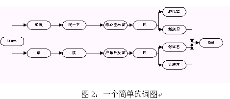 在語音識(shí)別中,語言模型是用來指導(dǎo)引擎進(jìn)行語音識(shí)別的,它限定了一個(gè)識(shí)別引擎所能表達(dá)的語句類型。在我們常用的圖搜索引擎中,語言模型是通過語法來表示的,語法是由一系列表示某個(gè)領(lǐng)域的語言表達(dá)方式的規(guī)則組成的(語法的具體書寫規(guī)則見引擎使用說明書)。這些規(guī)則會(huì)被被轉(zhuǎn)換成詞圖的形式然后用來指導(dǎo)語音的識(shí)別。所謂的詞圖是指由詞作為節(jié)點(diǎn)的一個(gè)圖,從該圖的開始節(jié)點(diǎn)到末尾節(jié)點(diǎn)的任一條路徑都是一個(gè)有效合法的句子。圖2給出了一個(gè)簡(jiǎn)單的詞圖。