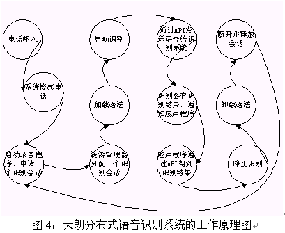 為了更好的應(yīng)用天朗分布式語音識(shí)別系統(tǒng)來開發(fā)應(yīng)用系統(tǒng),幫助開發(fā)人員理解天朗分布式語音識(shí)別系統(tǒng)的的工作原理,下面以一次語音識(shí)別的過程來解釋天朗分布式語音識(shí)別系統(tǒng)的工作原理。圖4給出了系統(tǒng)一次語音識(shí)別的工作原理。