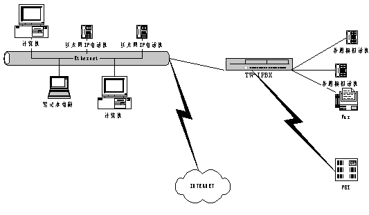 在一個(gè)有很多分支機(jī)構(gòu)的大企業(yè)的分部安裝Tw-IPBX ,通過IP 網(wǎng)絡(luò)與企業(yè)總部PBX 連接后后,可實(shí)現(xiàn)多種應(yīng)用,同時(shí)降低了成本。在這種應(yīng)用場(chǎng)景中,采用了基于IP 的傳輸機(jī)制(VoIP)。此種情況下VoIP的美好之處在于語音和數(shù)據(jù)的IP 傳輸管路需求(根據(jù)呼叫)的無縫可伸縮性,而無需任何靜態(tài)的分區(qū),這種解決方案可提供性能價(jià)格比極高且靈活的網(wǎng)絡(luò)運(yùn)作。