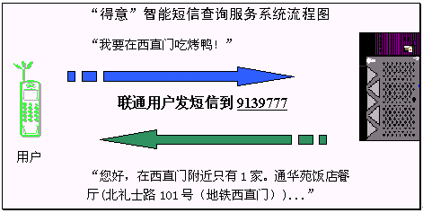 2004年4月15日和4月20日,擁有完全自主知識產(chǎn)權(quán)的語音與語言技術(shù)開發(fā)商和技術(shù)提供商北京得意音通技術(shù)有限責(zé)任公司(得意公司),在國際上率先把中文自然語言理解技術(shù)應(yīng)用在中國聯(lián)通和中國移動短信服務(wù)平臺上,結(jié)合《精品購物指南》報(bào)社權(quán)威、全面的信息資源,開通了北京地區(qū)餐飲領(lǐng)域智能短信查詢服務(wù)(簡稱智能短信),并將進(jìn)一步支持互聯(lián)網(wǎng)平臺和WAP平臺,陸續(xù)開通更豐富和更實(shí)用的智能信息服務(wù)。