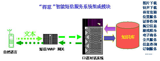 短信服務(wù)商只需通過"得意"口語對話系統(tǒng)與知識庫(或者相關(guān)的數(shù)據(jù)系統(tǒng))相聯(lián)接,就能徹底拋開厚重的手冊和復(fù)雜的編碼,代之以口語化的自然語言短信。原來無法開展,或者用戶難以使用的智能互動查詢服務(wù)都能快捷、簡單地開通,為用戶提供前所未有的、自然的、互動的信息服務(wù),如旅游交通、吃喝玩樂、金融證券、交友網(wǎng)聚、智力競猜、公共服務(wù)等等各個(gè)具體領(lǐng)域的服務(wù)。