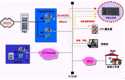 現(xiàn)在國內市場上的絕大部分錄音設備是基于語音板卡的,而VELOCE 是通過小巧的USB錄音模塊連接到話務員PC上,利用數(shù)字語音壓縮技術和加密技術把通話內容存儲到話務員PC, 并通過網(wǎng)絡傳輸?shù)椒⻊掌鳎?它是通過硬/軟件的錄音方式和網(wǎng)絡傳輸方式的結合體。