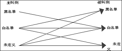 主/被叫黑白名單是號(hào)碼防火墻的一種簡(jiǎn)易實(shí)現(xiàn)方式。黑白名單能夠在有限分類的情況下,提供相對(duì)豐富的權(quán)限控制能力。具體說,黑白名單就是把電話號(hào)碼分為三類,并定義這些分類之間的呼叫限制。(如圖2)