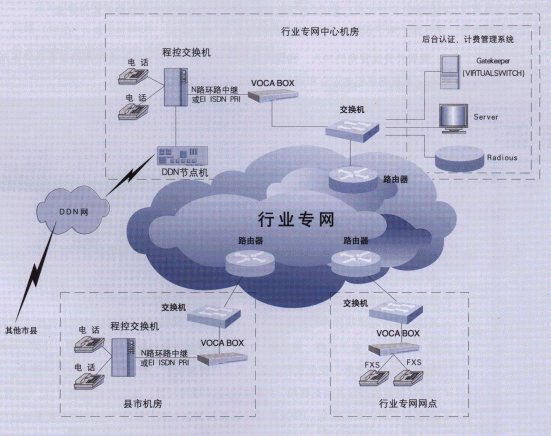 中心并設(shè)立一級(jí)計(jì)費(fèi)認(rèn)證及結(jié)算中心、網(wǎng)絡(luò)管理中心(VBMS),對(duì)網(wǎng)內(nèi)電話集中管理和計(jì)費(fèi)。通過在各地市機(jī)構(gòu)原有的內(nèi)部網(wǎng)絡(luò)基礎(chǔ)上增加數(shù)臺(tái)VOCABOX實(shí)現(xiàn)語(yǔ)音終端接入,并在地市機(jī)構(gòu)通過帶FXO接口的VOCABOX實(shí)現(xiàn)內(nèi)部IP電話與內(nèi)部電話網(wǎng)絡(luò)的呼叫轉(zhuǎn)接,網(wǎng)絡(luò)拓?fù)溥B接如下圖所示