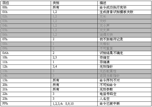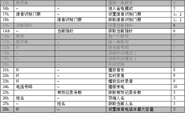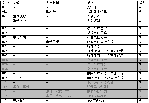 命令描述: 訓(xùn)練一個名字。當(dāng)增加一條電話本記錄時(shí),應(yīng)先執(zhí)行此命令。該命令會生成一個語音模板,同時(shí)產(chǎn)生一個長達(dá)2秒的名字錄音。在此命令成功執(zhí)行之后,MCPU接著發(fā)送06h命令增加電話號碼。如果沒有執(zhí)行06h命令,則該項(xiàng)記錄電話號碼為空。