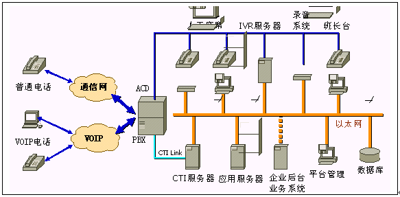 。。《XCCP呼叫中心系統(tǒng)》平臺,主要由PBX交換機(jī)、CTI服務(wù)器、IVR系統(tǒng)、應(yīng)用服務(wù)器、數(shù)據(jù)庫服務(wù)器、TTS系統(tǒng)、語音識別系統(tǒng)和座席系統(tǒng)等硬件設(shè)備和系統(tǒng)應(yīng)用軟件組成。它以電話服務(wù)為主要服務(wù)方式、結(jié)合計算機(jī)信息系統(tǒng)的資料數(shù)據(jù),為用戶提供全方位的服務(wù)。