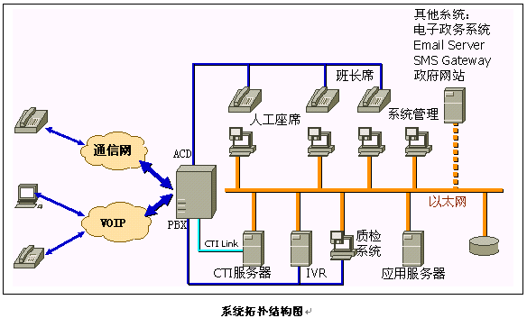 《政府呼叫中心系統(tǒng)》采用聲軟科技的《XCCP呼叫中心系統(tǒng)》平臺(tái),主要由PBX交換機(jī)、CTI服務(wù)器、IVR系統(tǒng)、應(yīng)用服務(wù)器、數(shù)據(jù)庫服務(wù)器、TTS系統(tǒng)和座席系統(tǒng)等硬件設(shè)備和系統(tǒng)應(yīng)用軟件組成。它以電話服務(wù)為主要服務(wù)方式、結(jié)合計(jì)算機(jī)信息系統(tǒng)的資料數(shù)據(jù),為用戶提供全方位的服務(wù)。