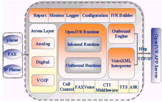 OpenIVR通過了業(yè)界主要的CTI中間件和PBX集成測(cè)試,是呼叫中心系統(tǒng)IVR服務(wù)器的理想選擇;而集成商只需簡(jiǎn)單掌握VoiceXML語(yǔ)言,就可以方便地定制業(yè)務(wù)及流程;下面是 OpenIVR系統(tǒng)結(jié)構(gòu)圖: