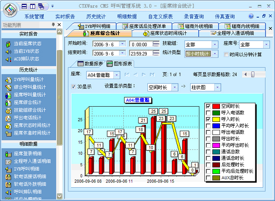 綜合呼叫量統(tǒng)計(jì):可以根據(jù)“月份”、“天”、“小時(shí)”、“半小時(shí)”、“周”來(lái)統(tǒng)計(jì)綜合呼叫量。統(tǒng)計(jì)的指標(biāo)包括:呼入電話總數(shù)、進(jìn)入ACD電話總數(shù)、ACD應(yīng)答電話數(shù)、ACD通話時(shí)長(zhǎng)、ACD放棄電話數(shù)、軟電話呼出電話數(shù)、軟電話呼出時(shí)長(zhǎng)、排隊(duì)接通率。