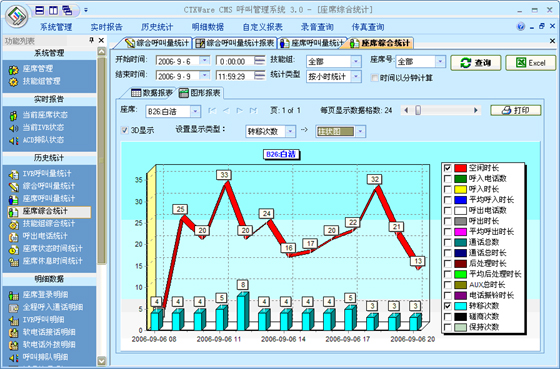 座席綜合統(tǒng)計(jì):可以根據(jù)“月份”、“天”、“小時(shí)”來(lái)統(tǒng)計(jì)每一個(gè)座席的綜合指標(biāo)。統(tǒng)計(jì)的指標(biāo)包括:總登錄時(shí)長(zhǎng)、空閑時(shí)長(zhǎng)、呼入電話數(shù)、呼入時(shí)長(zhǎng)、平均呼入時(shí)長(zhǎng)、呼出電話數(shù)、呼出時(shí)長(zhǎng)、平均呼出時(shí)長(zhǎng)、通話總數(shù)、通話總時(shí)長(zhǎng)、后處理時(shí)長(zhǎng)、平均后處理時(shí)長(zhǎng)、AUX總時(shí)長(zhǎng)、電話振鈴時(shí)長(zhǎng)、平均振鈴時(shí)長(zhǎng)、轉(zhuǎn)移次數(shù)、磋商次數(shù)、保持次數(shù)、平均保持時(shí)長(zhǎng)。