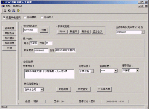 系統(tǒng)提供人工座席代表直接與居民對話,記錄舉報、投訴、批評、建議等情況,解釋政府相關(guān)政策法規(guī);可以將用戶來電直接將轉(zhuǎn)到各政府部門和和市(縣)政府領(lǐng)導(dǎo),以應(yīng)對緊急事件的發(fā)生;可通過外撥市民(人民群眾)電話,將緊急或疑難問題的處理結(jié)果主動反饋給百姓;或利用外撥功能開展民意調(diào)查,調(diào)研,幫助政府制定出最符合群眾利益的政策,更好地實踐"三個代表"重要思想和帶領(lǐng)人民群眾全面建設(shè)小康社會。