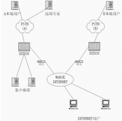 通過(guò)HXD09智能型可編程交換機(jī)構(gòu)建分布式呼叫中心(一個(gè)主呼叫中心,多個(gè)分呼叫中心),IPV 實(shí)現(xiàn)語(yǔ)音的遠(yuǎn)程傳輸;實(shí)現(xiàn)遠(yuǎn)程專(zhuān)家咨詢、集中管理座席的功能,其方式如下圖所示:
