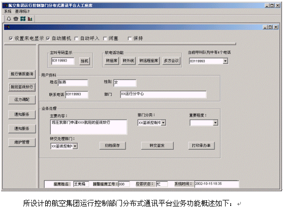 航空集團(tuán)運(yùn)行控制部門(mén)分布式通訊平臺(tái)系統(tǒng)的軟件設(shè)計(jì)采用業(yè)界先進(jìn)的三層CLIENT/SERVER體系結(jié)構(gòu),集目前先進(jìn)的計(jì)算機(jī)技術(shù)、通信技術(shù)、計(jì)算機(jī)電信集成(CTI)技術(shù)、呼叫接入技術(shù)、智能接入交換分配技術(shù)、數(shù)字語(yǔ)音處理技術(shù)、異構(gòu)系統(tǒng)信息交互技術(shù)、安全容錯(cuò)技術(shù)、網(wǎng)絡(luò)組網(wǎng)技術(shù)等于一體,并與航空集團(tuán)運(yùn)行控制部門(mén)已有技術(shù)支持系統(tǒng)(如飛行運(yùn)行控制系統(tǒng)、航路計(jì)劃系統(tǒng))緊密結(jié)合在一起,突破時(shí)空的限制,通過(guò)人工座席、自動(dòng)語(yǔ)音/傳真、相關(guān)部門(mén)工作人員等為集團(tuán)內(nèi)部提供電話、傳真服務(wù)形式的周到、快捷、全方位的通信服務(wù)。