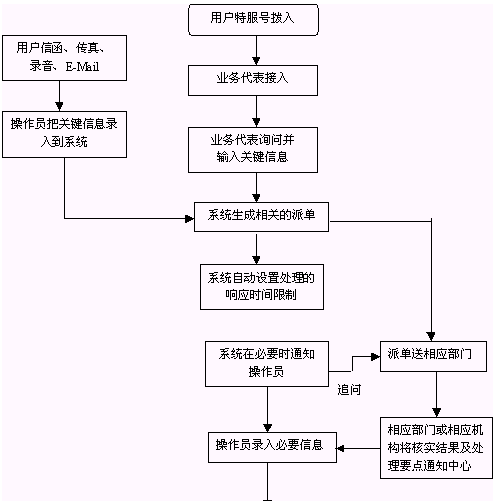 人民群眾打入電話后,當(dāng)系統(tǒng)的自動(dòng)語(yǔ)音應(yīng)答子系統(tǒng)無(wú)法解決客戶問(wèn)題時(shí),客戶可選擇人工服務(wù),由企業(yè)客戶服務(wù)代表直接接聽(tīng)客戶電話,處理并解決客戶問(wèn)題。此時(shí)客戶同座席話務(wù)人員直接溝通,并同時(shí)記錄下該客戶的聯(lián)系方式,將相關(guān)數(shù)據(jù)添加入系統(tǒng)數(shù)據(jù)庫(kù);也可以在數(shù)據(jù)庫(kù)的支持下回答質(zhì)量監(jiān)督咨詢、投訴等?蛻粢部梢赃x擇自動(dòng)語(yǔ)音服務(wù)方式,根據(jù)系統(tǒng)的語(yǔ)音提示輸入按鍵,選擇類別,將自己的投訴和建議以及自己的聯(lián)系方式信息以留言錄音的方式保存在系統(tǒng)中。系統(tǒng)同時(shí)還支持自動(dòng)傳真方式,客戶可以通過(guò)傳真機(jī)進(jìn)入本系統(tǒng),通過(guò)按鍵選擇傳真方式,將自己的意見(jiàn)建議等的文本內(nèi)容傳真給系統(tǒng),系統(tǒng)自動(dòng)接受并存入數(shù)據(jù)庫(kù)。